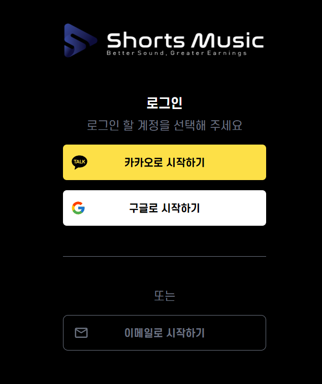 먼저 쇼츠뮤직에 이동하여 <쇼츠뮤직 시작하기>를 누른 후 회원가입을 진행합니다.