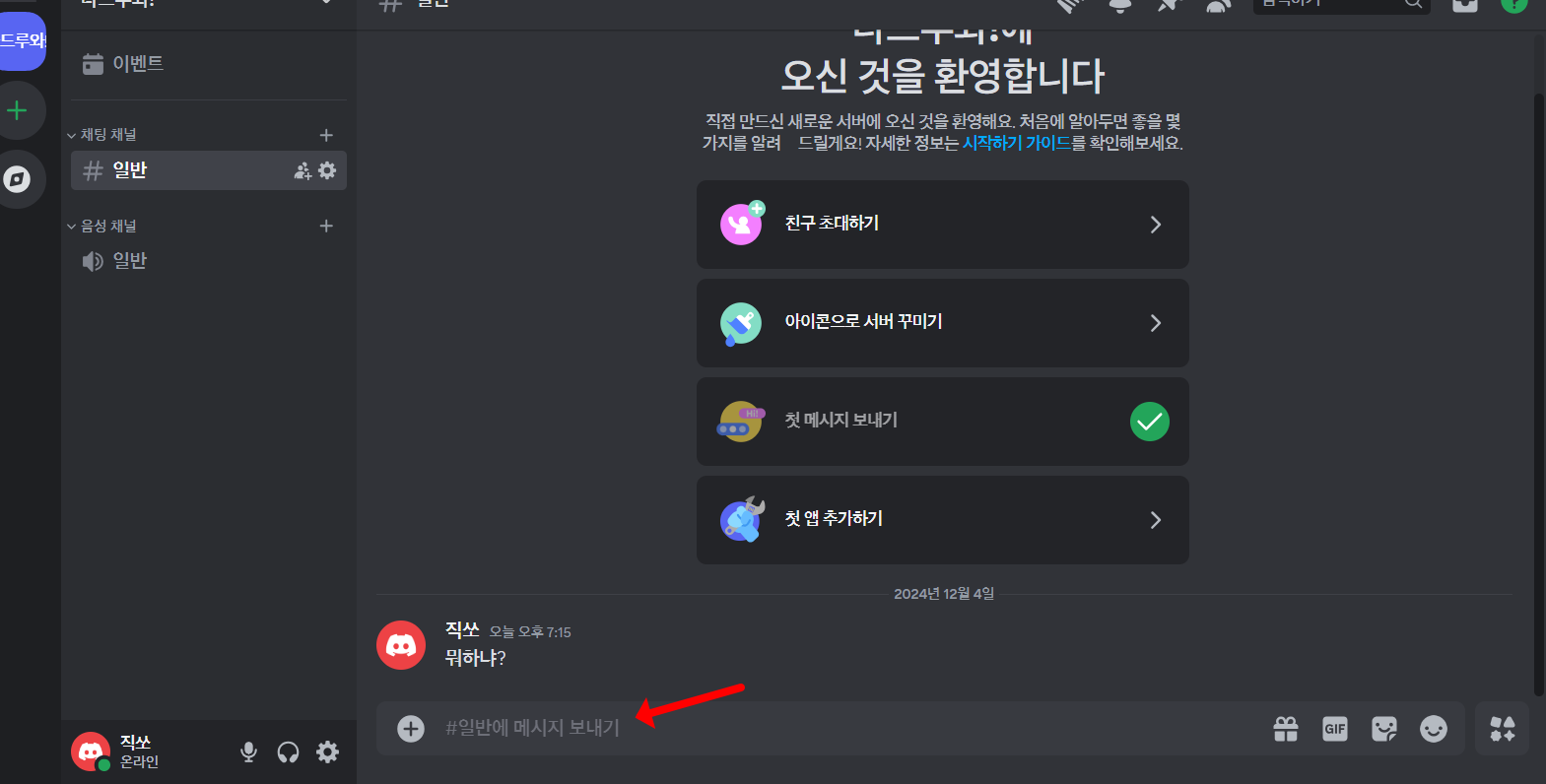 음성대화를 하기 위해서는 왼쪽 일반 아래 음성채널을 따로 초대코드를 보내야 합니다.