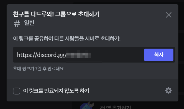방을 만들면 왼쪽에 내가 생성한 그룹이 나옵니다. 해당 버튼을 누른 후 톱니바퀴 버튼을 누르면 바로 초대하기 링크가 나옵니다. 이 링크를 친구들에게 카톡이나 메시지로 공유하시면 들어올 수 있습니다.
