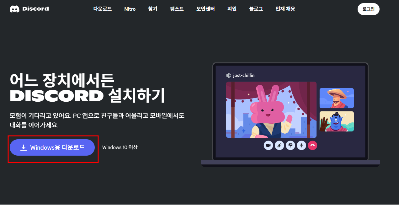 디스코드는 홈페이지에서 설치파일을 다운받을 수 있습니다.