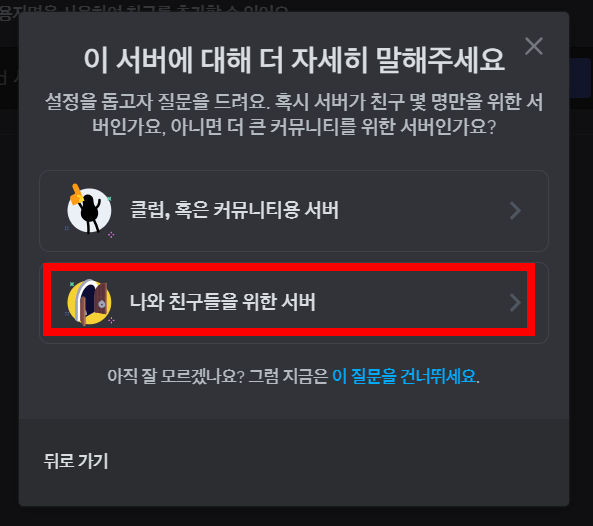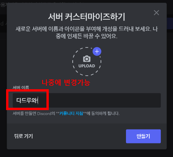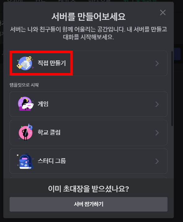 누르시면 아래와 같이 직접 만들기 -> 나와 친구들을 위한 서버 를 누르시고 -> 서버이름 작성 하시면 됩니다.